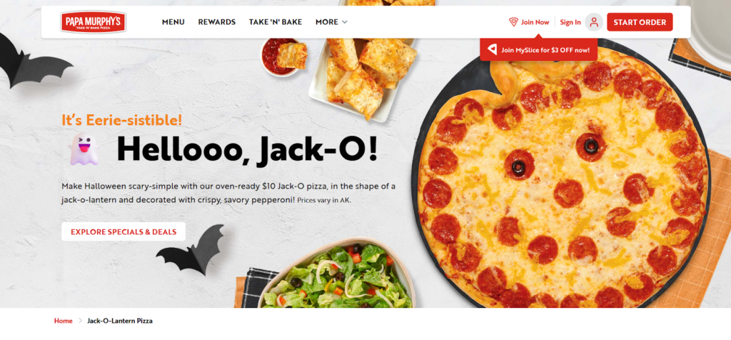 Papa Murphy’s の「Jack-O ピザ」は毎年話題になり、チーズやオリーブで“おばけの顔”をデザインするなど、見た目も楽しい工夫が施されています。SNSでも映えること間違いなし。